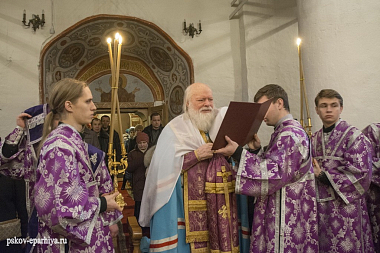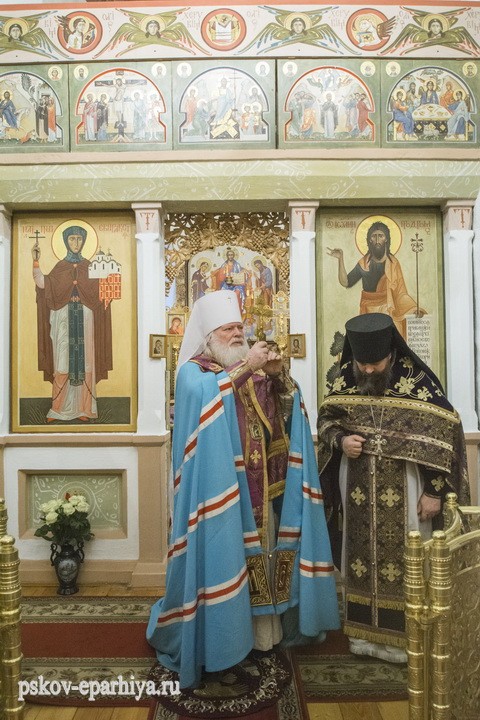 По завершении молебного пения Псковский архипастырь поздравил наместника и братию обители, духовенство и всех молящихся с праздником в честь обретения честной главы Иоанна Крестителя и обратился к молящимся с архипастырским словом: