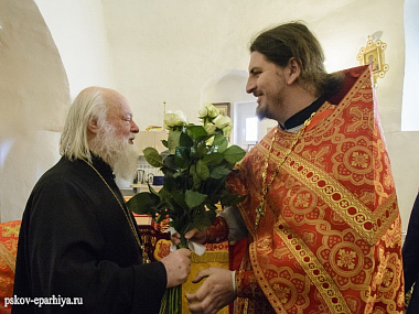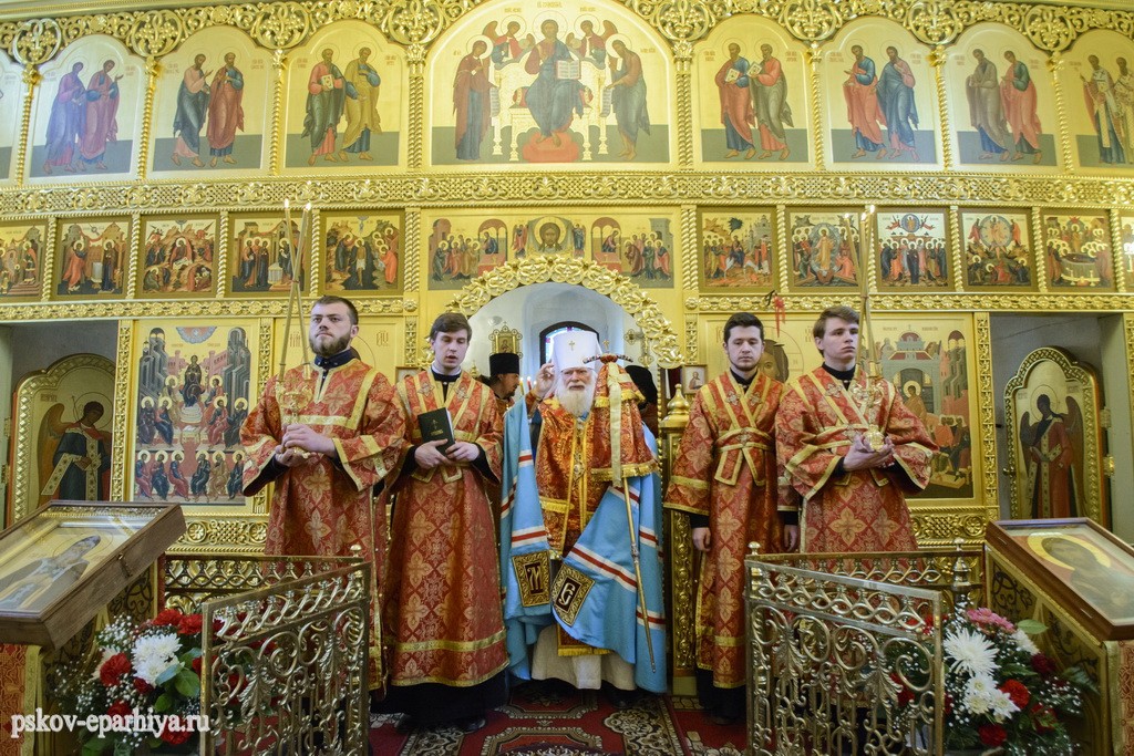По завершении молитвословия Псковский архипастырь поздравил всех богомольцев с престольным праздником и обратился к собравшимся с проповедью: