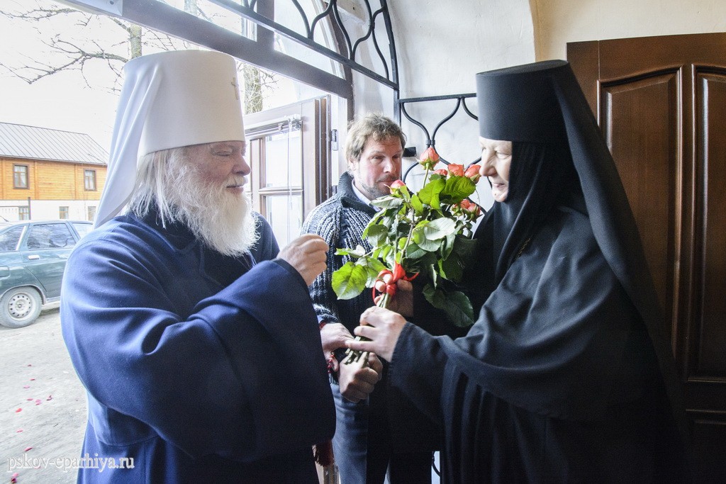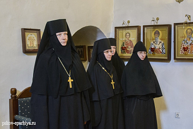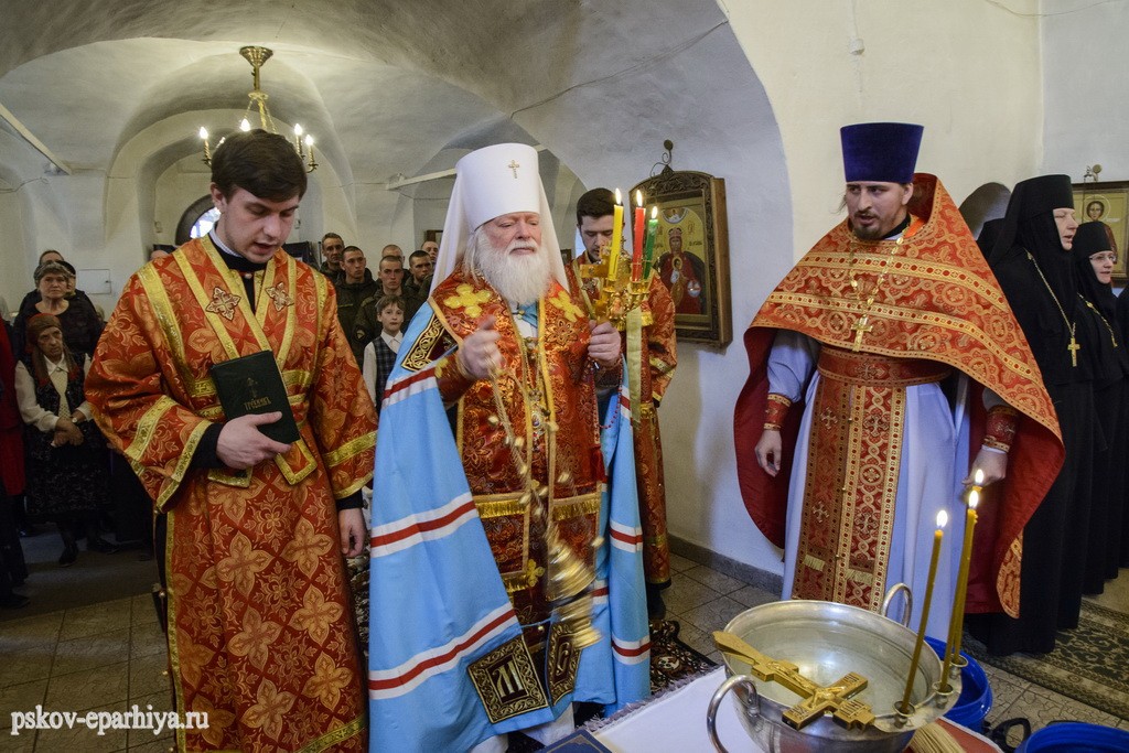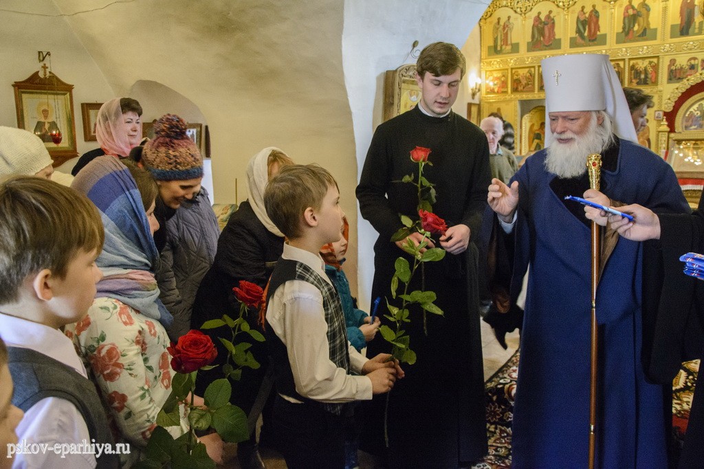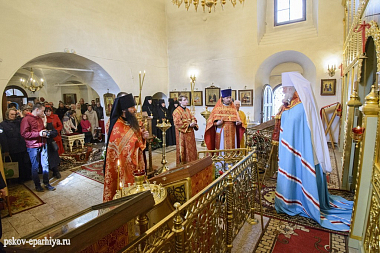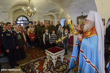 За богослужением молились настоятельница Спасо-Елеазаровской обители игумения Евфросиния (Головнева) и настоятельница Рождества Богородицы Снетогорского монастыря игумения Татиана (Пашкова) с сестрами обителей, прихожане и паломники, а также воины псковского военного гарнизона.