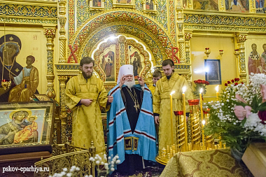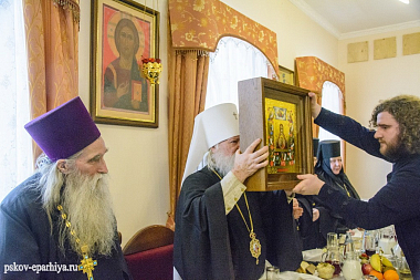 За радость молитвенного общения и непрестанное архипастырское попечение о вверенной ему пастве Владыку митрополита поблагодарила настоятельница обители игумения Евфросиния (Головнева) и преподнесла Его Высокопреосвященству образ Пресвятой Богородицы, а также пожелала псковскому архипастырю многая и благая лета.