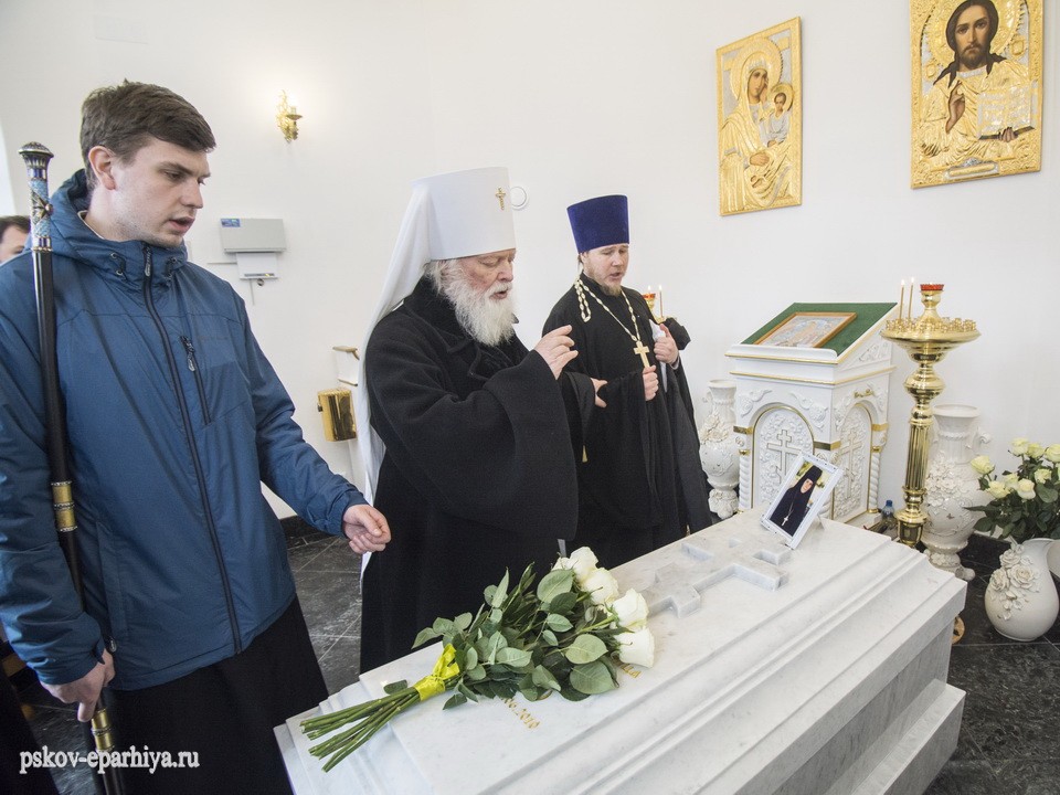 Затем все собравшиеся во главе с митрополитом Евсевием направились к часовне, установленной на могиле бывшей настоятельницы Елеазаровской обители игумении Елисаветы (Беляевой), где Псковским архипастырем была совершена заупокойная лития.