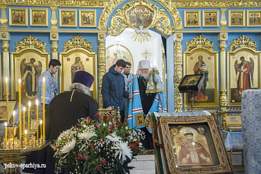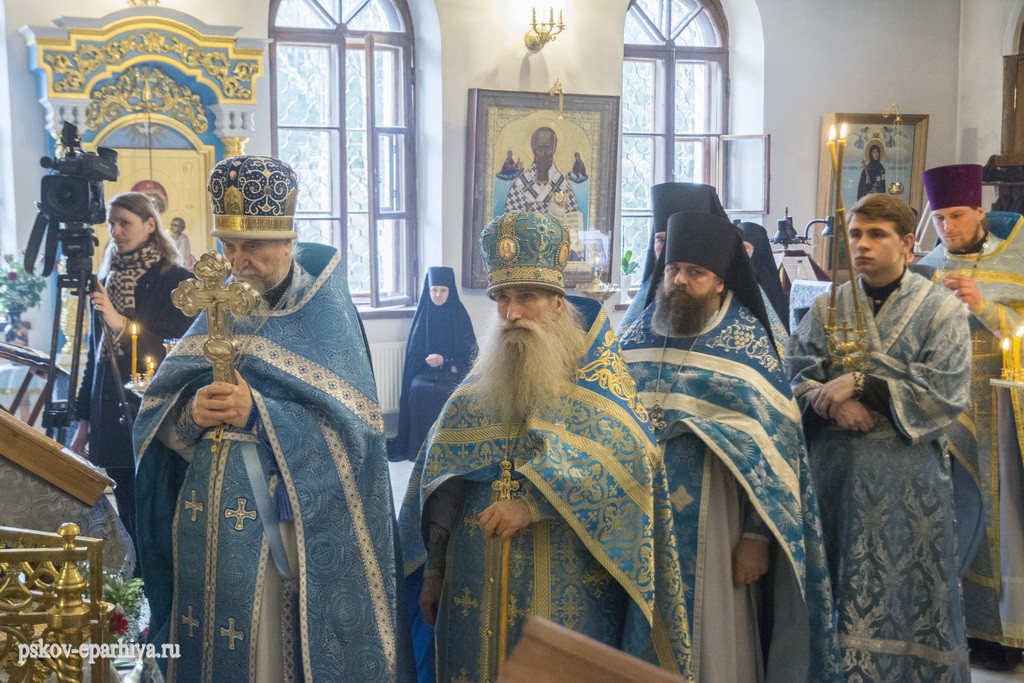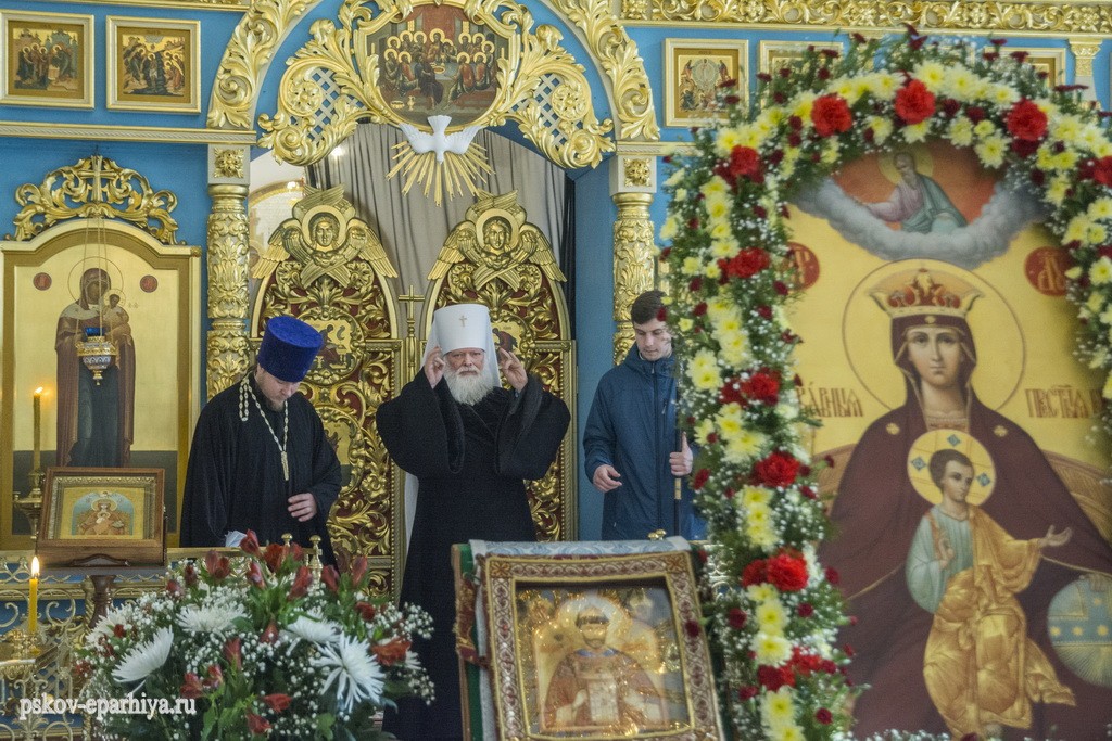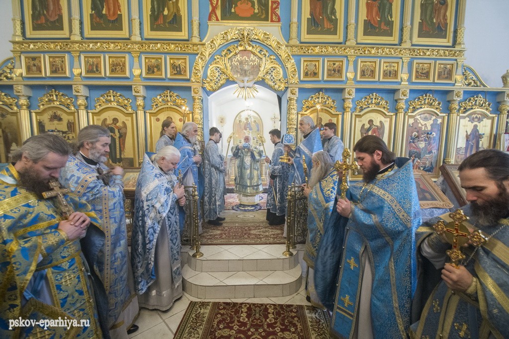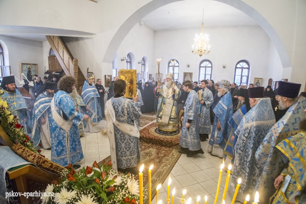 По отпусте Божественной литургии Псковский архипастырь возглавил праздничный молебен, в завершение которого прочел молитву Усердной Заступнице рода христианского, испрашивая Ее защиты и помощи всем молящимся. Затем было пропето величание Пресвятой Богородице и провозглашены традиционные многолетия.