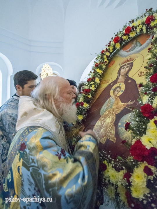 Вспомним историю нашей Родины: во многие лютые, страшные, опасные годы Матерь Божия являла Свою милость – и во время татаро-монгольского ига, и во время нашествия шведов, ливонцев, поляков, которые стремились нашу Русь уничтожить, а нашу веру, святую, православную, удалить от России. И новое время, революционное, страшное время разрухи, уничтожения и народа нашего, и культуры нашей, и даже святых мест, Матерь Божия всё равно не оставила нашей родной России. После того, как насильно удалили нашего русского императора царя Николая, в это же время, в этот же день в пригороде Москвы, в селе Коломенском тогда, а теперь это уже и Москва, в Казанском храме была обретена, явлена икона Божией Матери и названа "Державная", потому что на ее явленном чудотворном образе были знаки царской власти державы Российской. И, несмотря ни на какие гонения и уничтожения, Матерь Божия осталась с нами. Она не осталась где-то в одном месте – теперь Она прославляется по всей России. И к нам пришел этот образ. Он не простой. Этот образ вместе с другими иконами по благословению Святейшего Патриарха Алексия II посетил нашу Россию со всех сторон – и с севера, и с запада, и с востока, и с юга. И потом уже прибыл к нам как дар нашей Псковской земле и покойной игумении Елисавете.