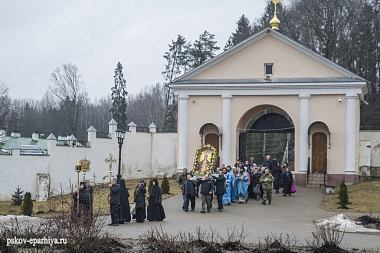 Мы вчера отмечали печальное столетие отстранения от власти царской нашего императора Николая II, а сегодня, благодарение Богу, мы чтим явление в самом сердце нашей России, во граде Москве, Богоматери "Державная". От нее происходили и происходят чудеса. Об этом велась запись тогда. Когда Церковь гонима была от богоборческой власти, всё было скрыто, некоторое время было неизвестно ее местонахождение. Но в девяносто пятом году прошлого столетия она была найдена в домовом храме издательства журнала Московской Патриархии. Там был храм домовый в честь Преподобного Иосифа Волоцкого, в алтаре которого и находился этот чудотворный образ, как бы скрытый от тех богоборцев, которые разрушали наши святыни. А затем уже, когда мы получили свободу в служении, в молитве и вере нашей, этот образ был возвращен Святейшему Патриарху Московскому, он снова был принесен в Казанский храм города Москвы, на месте, некогда именовавшемся селом Коломенским. И с этого образа было написано девять копий, и с этими иконами в 2007 году был совершен крестный ход вокруг России. Один из этих образов Богоматери был доставлен и на нашу Псковскую землю. Первые несколько лет он находился в часовне, которая построена уже при нас на вокзале нашем железнодорожном, а затем была принесена сюда и стала святыней нашей Спасо-Елеазаровской обители. В честь этого чудотворного образа затем здесь был поставлен, хотя и небольшой, храм в честь Державной Божией Матери, где теперь пребывает эта святыня.