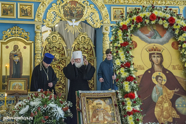 Перед началом богослужения в Трехсвятительский собор обители из храма Державной иконы Божией Матери Спасо-Елеазаровского монастыря крестным ходом была принесена Державная икона Божией Матери, написанная по благословению Святейшего Патриарха Московского и всея Руси Алексия II и принимавшая участие во Всероссийском крестном ходе 2007 года. Также в этот день в обитель был привезен мироточивый образ святого мученика царя Николая II.