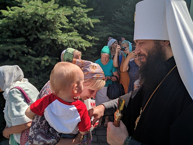 За Божественной литургией Его Высокопреосвященству сослужили игумен обители игумен Гавриил (Куликов) и братия монастыря в священном сане.