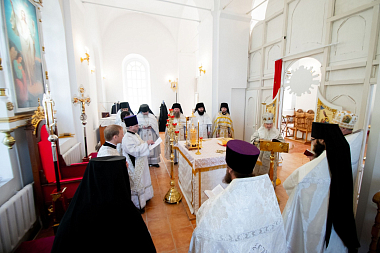 Его Высокопреосвященству сослужили: и. о. настоятеля Макарьевской пустыни иеромонах Амвросий (Горновский), секретарь Казанского епархиального управления протоиерей Владимир Самойленко, благочинный I Казанского округа протоиерей Алексий Чубаков, наместник Казанско-Богородицкого мужского монастыря игумен Марк (Виленский), настоятель Введенского Кизического мужского монастыря игумен Пимен (Ивентьев), наместник Свияжского Богородице-Успенского мужского монастыря игумен Симеон (Кулагин), братия Макарьевской обители в священном сане.