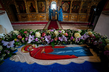 По заамвонной молитве был совершён молебен ко Пресвятой Богородице и крестный ход вокруг храма. После молитвенного шествия в храме перед Плащаницей Пресвятой Богородицы были пропеты тропарь, кондак и величание Царице Небесной.