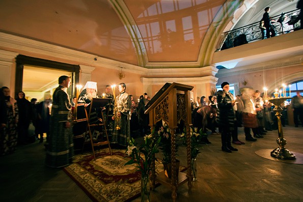 Песнопения повечерия исполнил архиерейский мужской хор под руководством Дениса Рогова.