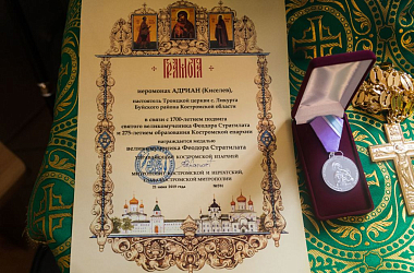 На малом входе иеромонах Адриан (Киселев), настоятель Троицкой церкви с. Ликурга Буйского района Костромской области, в связи с 1700-летием подвига святого великомученика Феодора Стратилата и 275-летием образования Костромской епархии награжден медалью великомученика Феодора Стратилата.