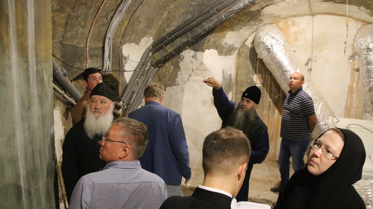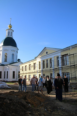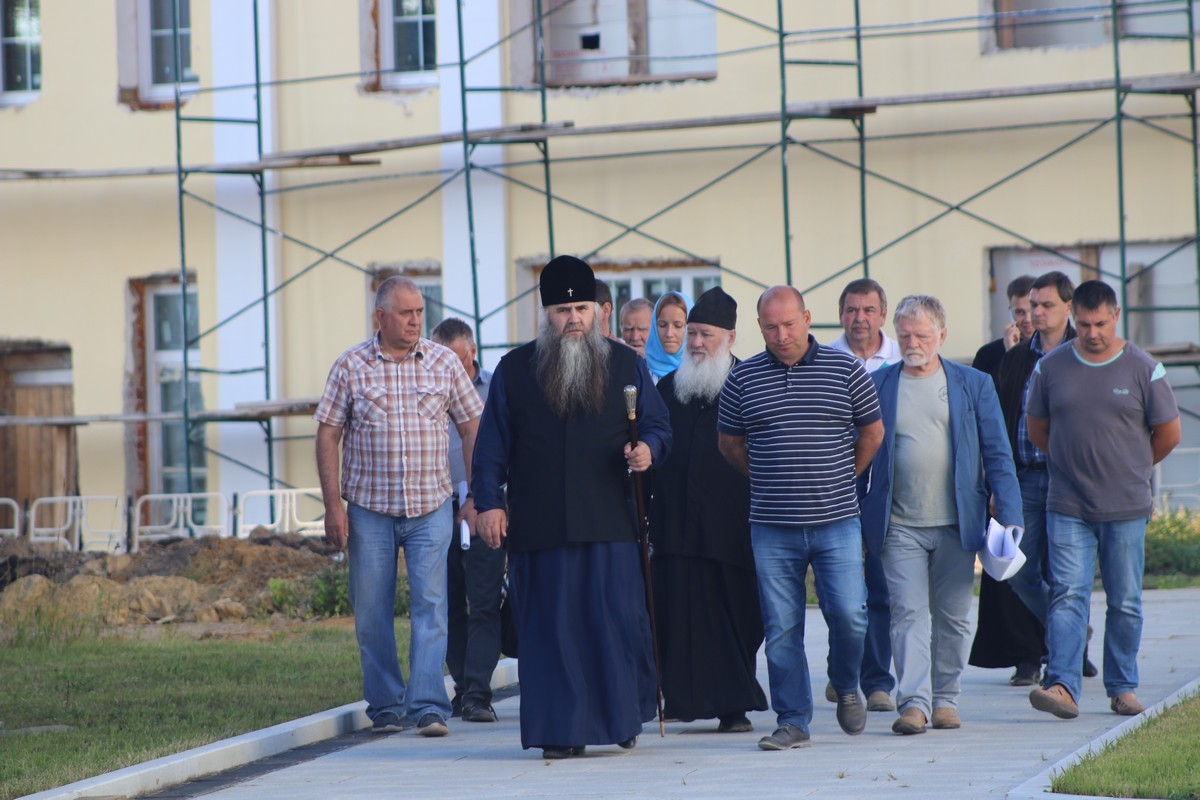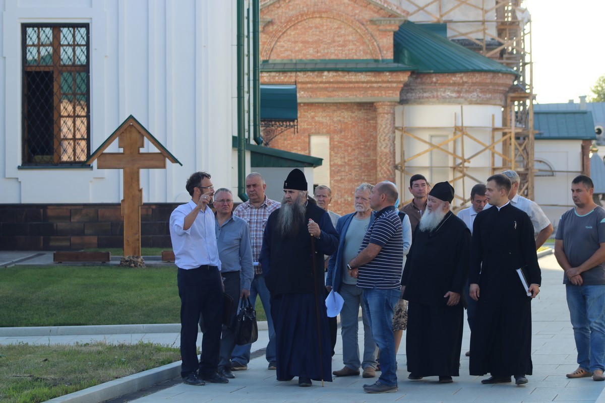 На территории Свято-Успенского мужского монастыря правящего архиерея встречали главный инженер обители Андрей Столяров, директор ООО «Региональный инженерный центр» Юрий Коваль, руководитель иконописной мастерской «Ковчег» Алексей Анциферов, директор строительной фирмы «Даниилов град» Александр Третьяков и другие представители подрядных организаций.
