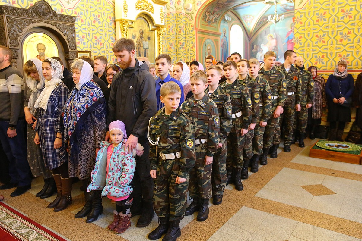 На Литургии присутствовали глава местного самоуправления городского округа город Выкса Владимир Кочетков, депутат Законодательного собрания Нижегородской области Валерий Анисимов, воспитанники и педагоги общественной военно-патриотической организации «Православные витязи» (г. Выкса) и Национальной организации витязей.