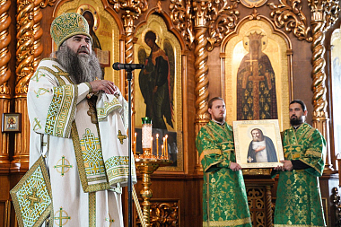 Во время богослужения на раку с мощами преподобного Серафима Саровского был временно возложен его святой образ, предназначенный для храма царственных страстотерпцев в Сарове.