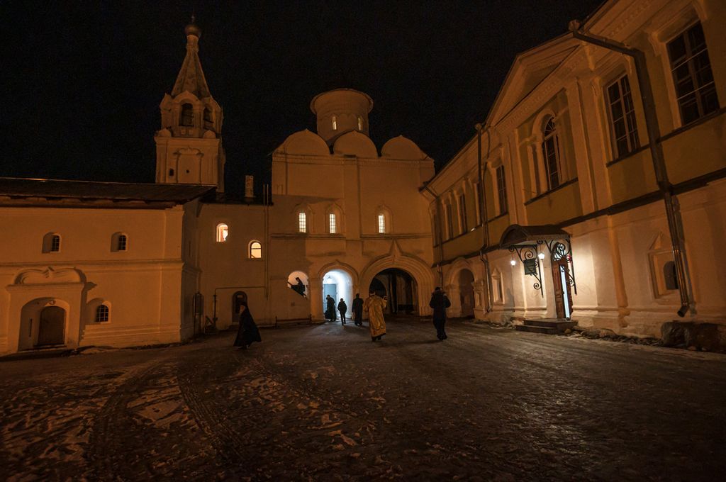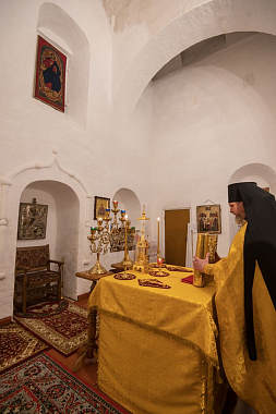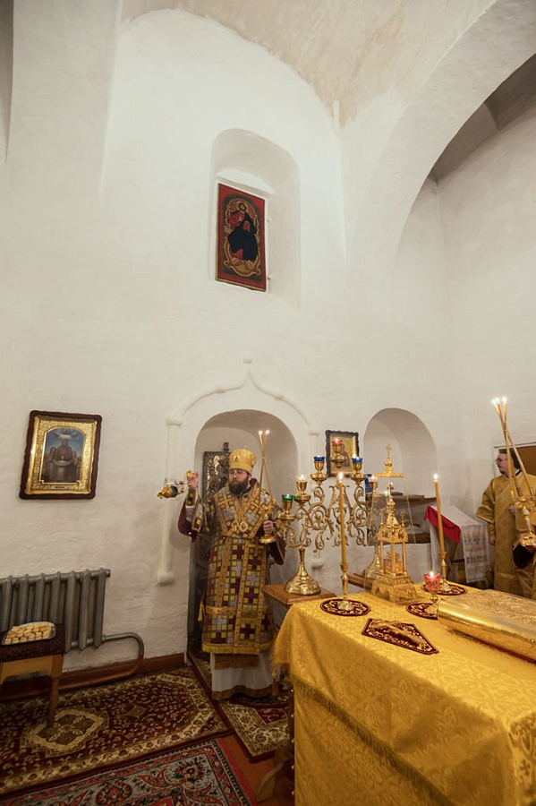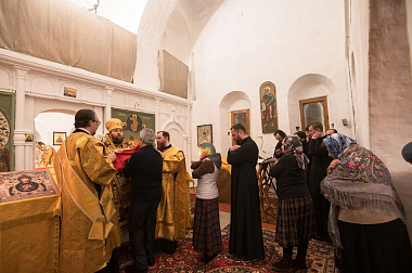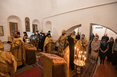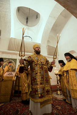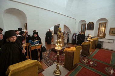 Его Высокопреосвященству сослужили и.о. наместника Спасо-Прилуцкого монастыря иеромонах Александр (Чеборов), руководитель Службы протокола иерей Алексей Булеков, келарь монастыря иеромонах Ферапонт (Широков), заведующий канцелярией монастыря иеромонах Алексий (Скворцов), клирики Вологодской епархии.