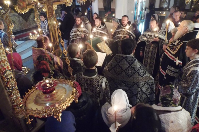 Священнослужители соборно прочли акафист Страстям Христовым, а затем Евангелие на эту же тему.