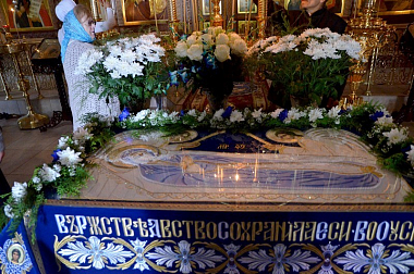 Пусть ничто нечистое не посещает нас в эти священные минуты, когда мы идем на погребение Матери Божией,идем со знанием того, что буквально через какое-то мгновение Господь воскресит Свою Матерь и возьмет к Престолу Божию.И с того мгновения Матерь Божия – первая Ходатаица за род человеческий. И пусть каждый из нас обращается к Ней со своими искренними сердечными молитвами, прося Ее склонить к милости Суд Божий, покрыть нас Своим честным Омофором, избавить нас от всякого зла».