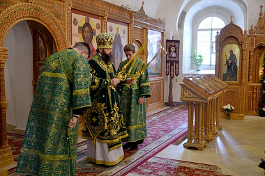 Архипастырю сослужили проректор по научной работе СПДС, настоятель храма святого апостола Иоанна Богослова игумен Тарасий (Ланге), священник Свято-Успенского кафедрального собора иеромонах Анатолий (Ефименков), заведующий кафедрой богословия и церковно-исторических дисциплин Смоленской православной духовной семинарии иеромонах Рафаил (Ивочкин), настоятель святой обители игумен Николай (Золотов), заведующий заочным отделением СПДС иеромонах Лука (Лисовский).