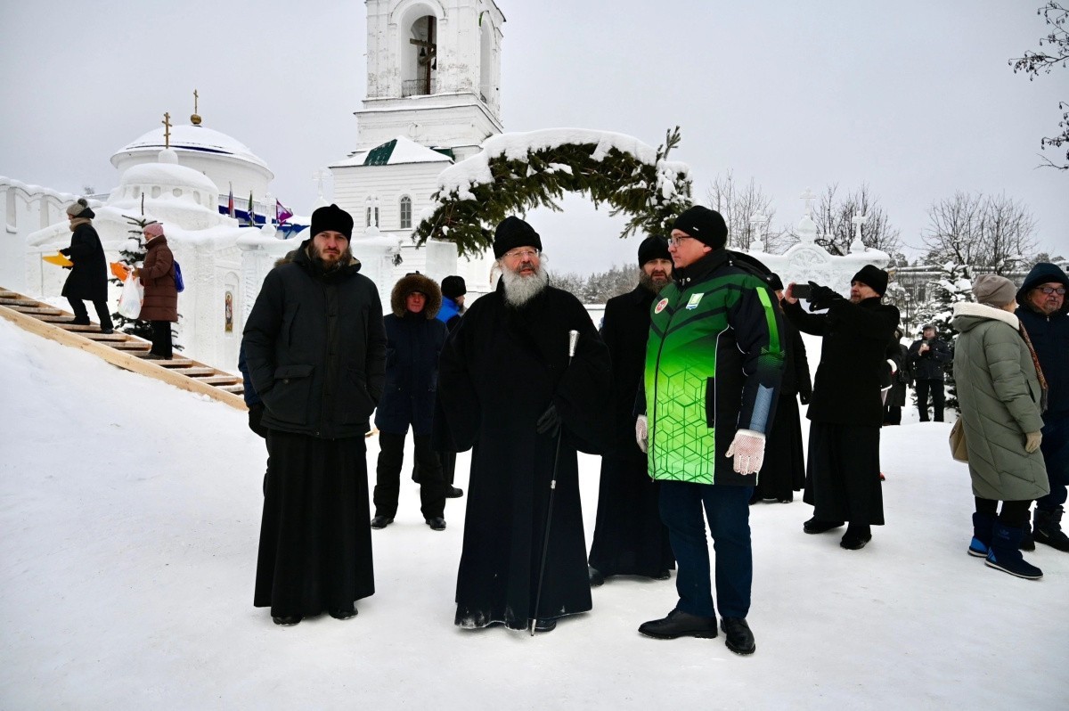 Во время осмотра архипастыря сопровождали глава Зеленодольского муниципального района Михаил Афанасьев, секретарь Татарстанской митрополии иеромонах Кирилл (Корытко), наместник Раифского монастыря игумен Гавриил (Рожнов). Отец Гавриил рассказал гостям о мастерах, которые трудились над созданием праздничных локаций и о ходе фестиваля «Лёд и свет».
