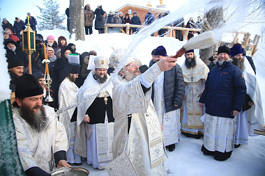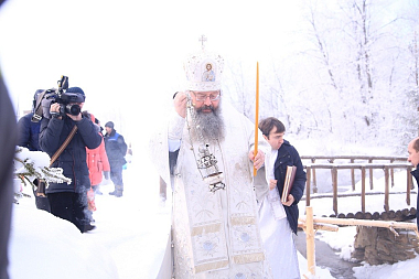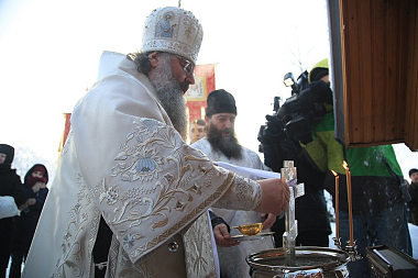 По окончании богослужения митрополит Кирилл в сослужении духовенства и молящихся совершил Великое освящение воды.