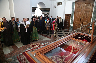 Затем духовенство вместе с паствой поклонились мощам святого мученика священника Константина Богоявленского в храме Архангела Михаила.