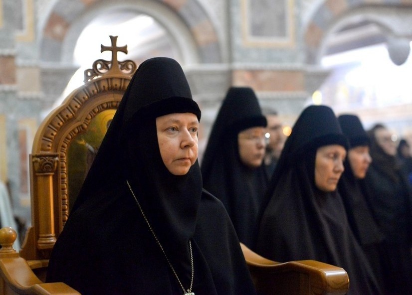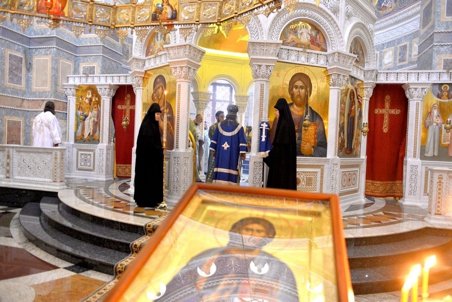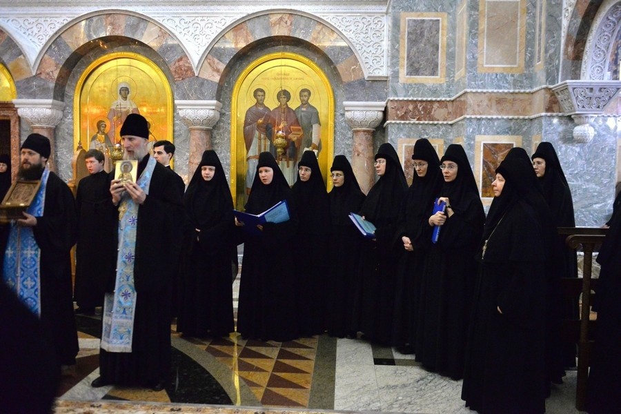 За богослужением молились настоятельница Ново-Тихвинской обители игумения Домника (Коробейникова) с сестрами.