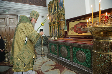 Перед богослужения митрополит Кирилл поклонился мощам священномученика Константина Богоявленского – священника, который в 1917–1918 годах служил в селе Меркушино и пострадал от рук большевиков. Мощи священномученика Константина почивают в Михаило-Архангельском храме.