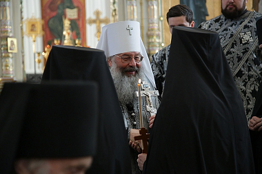 Его Высокопреосвященству сослужили: секретарь епархиального управления Екатеринбургской епархии иеромонах Кирилл (Корытко), наместник Свято-Николаевского монастыря игумен Иероним (Миронов), братия обители в священном сане и клирики Екатеринбургской епархии.