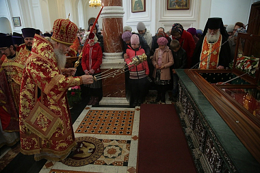 Затем митрополит Кирилл обратился с архипастырским словом к участникам богослужения, напомнив, что в этот день 30 лет назад совершилось возвращение мощей праведного Симеона в церковную жизнь.