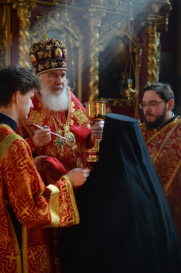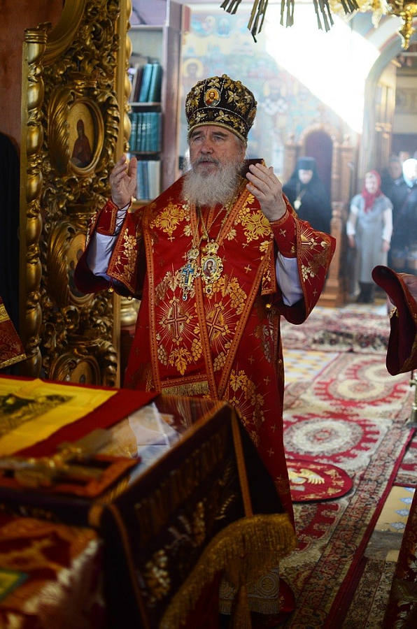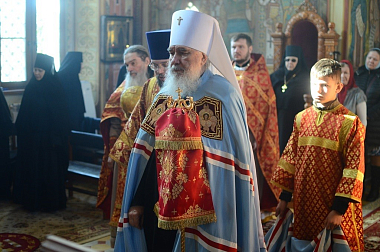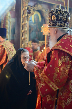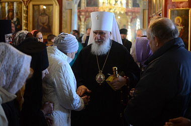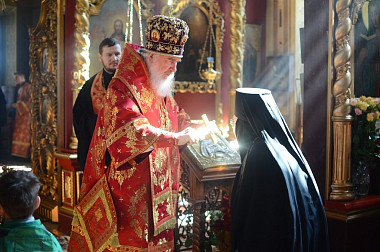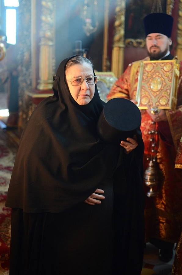 На малом входе владыка Климент вручил игумении Феофиле (Лепешинской) за труды, понесенные в течение многолетнего служения в качестве настоятельницы монастыря, и в соответствии с указом Святейшего Патриарха Московского и всея Руси Кирилла крест с украшениями.