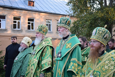 Его Высокопреосвященству сослужили архиепископ Песоченский и Юхновский Максимилиан, епископ Козельский и Людиновский Никита, епископ Тарусский Иосиф, наместник монастыря иеромонах Пафнутий (Архипов), благочинные храмов г. Калуги протоиерей Андрей Богомолов и иерей Константин Комаров, а также клирики Калужской, Козельской и Песоченской епархий.