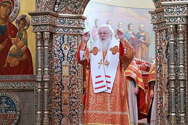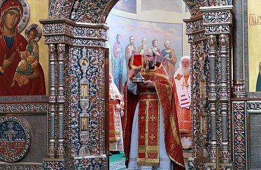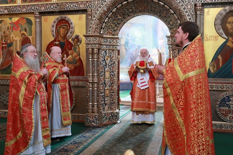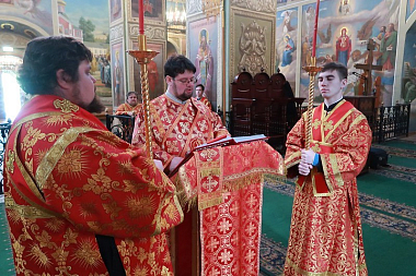 Его Высокопреосвященству сослужили и.о. наместника монастыря иеромонах Антоний (Битьмаев), насельники монастыря иеромонахи Борис (Григорьев), Евсевий (Голубев) и Пантелеимон (Шахтахтинский) и клирик Софийского собора иерей Николай Полозов.