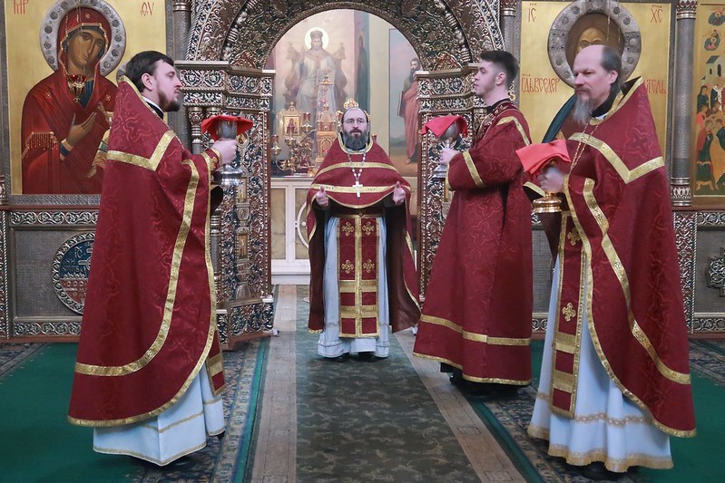 Богослужение сопровождалось пением мужского хора Новгородского духовного училища и всех молящихся в храме под управлением регента диакона Андрея Каурова.