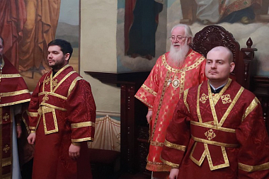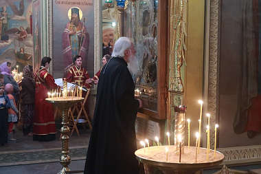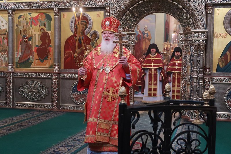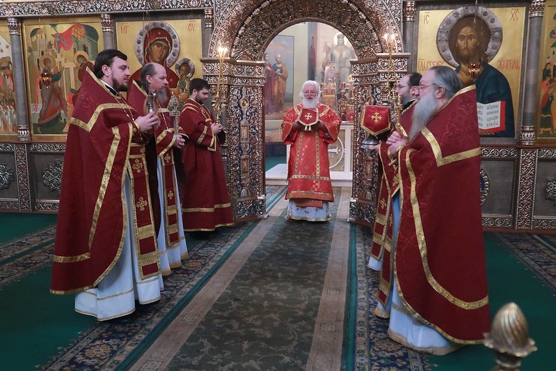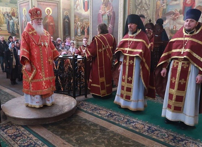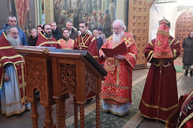 Его Высокопреосвященству сослужили и.о. наместника обители иеромонах Антоний (Битьмаев), насельники монастыря иеромонахи Борис (Григорьев) и Пантелеимон (Шахтахтинский), клирик Софийского собора иерей Николай Полозов.