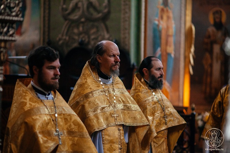 Богослужение сопровождалось пением мужского хора Новгородского духовного училища и всех молящихся в храме под управлением регента диакона Андрея Каурова.