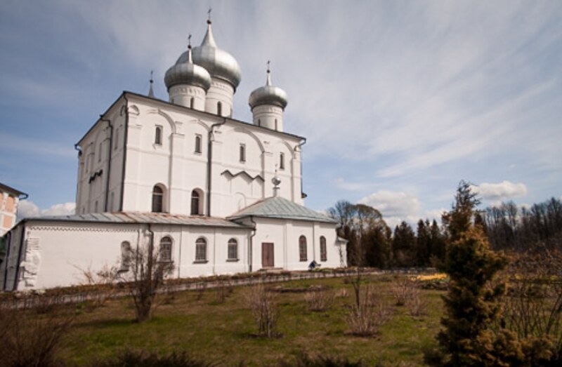 Согласно народному преданию место это находилось во власти нечистой силы и называлось «Хутынь», то есть худое место. Здесь уединился для молитвы монах Варлаам (в миру Алекса Михалевич). Однажды к нему прибыл князь Ярослав. Варлаам, благословляя его, сказал: «Будь здоров, князь, и с благородным сыном твоим». Это приветствие изумило князя, не знавшего еще о рождении младенца (это было в 1190 году). Срубив келию и одержав победу над нечистой силой, он поставил сначала деревянный, а затем каменный храм во имя Преображения Господня (церковь Спаса на Хутыни). Церковь была освящена 6 августа 1192 года архиепископом Григорием. Храм не сохранился. В 1515 году был построен Спасо-Преображенский собор. Самой известной постройкой монастыря считают церковь Григория Армянского.