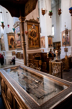 В 1471 году в Хутынский монастырь приехал Иоанн Васильевич Третий, дабы поклониться святым мощам, и, по легенде, стал выпытывать у игумена, почему не вскрывают раки, чтобы все могли прикладываться ко святым мощам. Когда по его повелению стали раскапывать могилу преподобного Варлаама, из земли вырвался огненный столб, опаливший стену и южную дверь иконостаса. Великий князь в ужасе побежал из церкви, ударяя посохом в землю, причем из земли выходил огонь не только в церкви, но и в монастыре. Бросив посох, великий князь в большом страхе покинул монастырь. Этот посох и опаленная дверь алтаря хранились в монастырской ризнице.