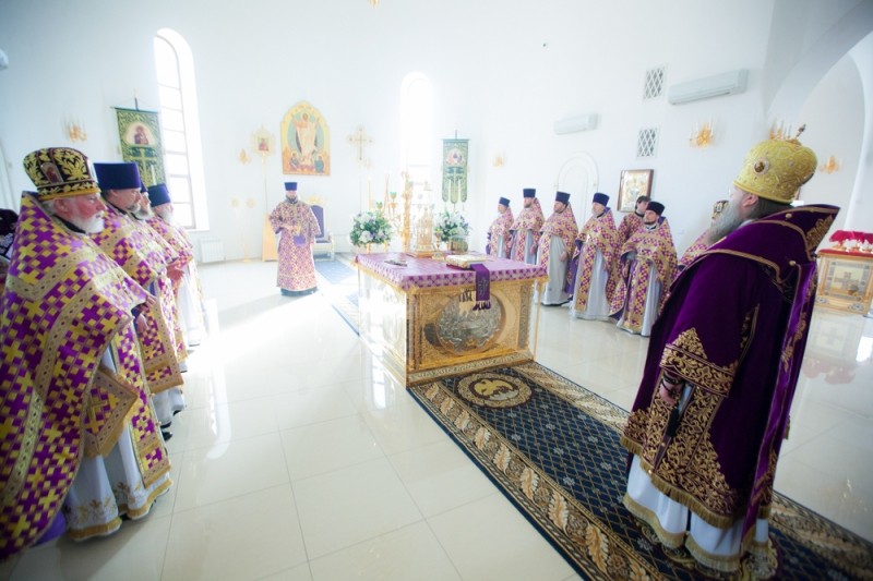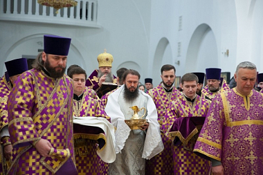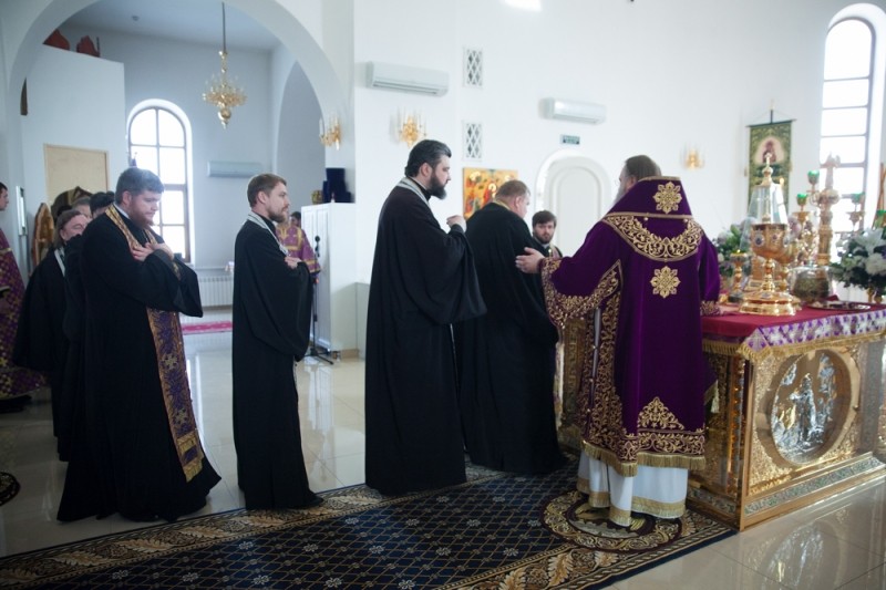 Затем состоялась общая исповедь духовенства, после которой митрополит Ростовский и Новочеркасский Меркурий совершил Литургию Преждеосвященных Даров. Его Высокопреосвященству сослужили секретарь митрополита Ростовского и Новочеркасского по г. Ростову-на-Дону протоиерей Иоанн Осяк, клирики епархии.