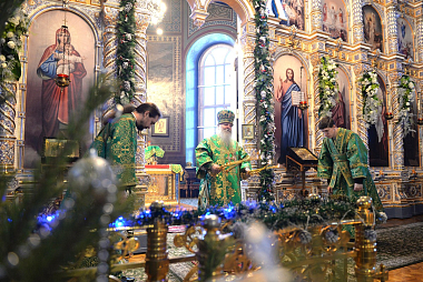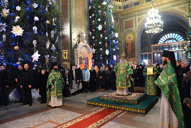 Перед началом богослужения глава Липецкой митрополии поклонился честным мощам святителя Тихона, епископа Воронежского и Задонского чудотворца.