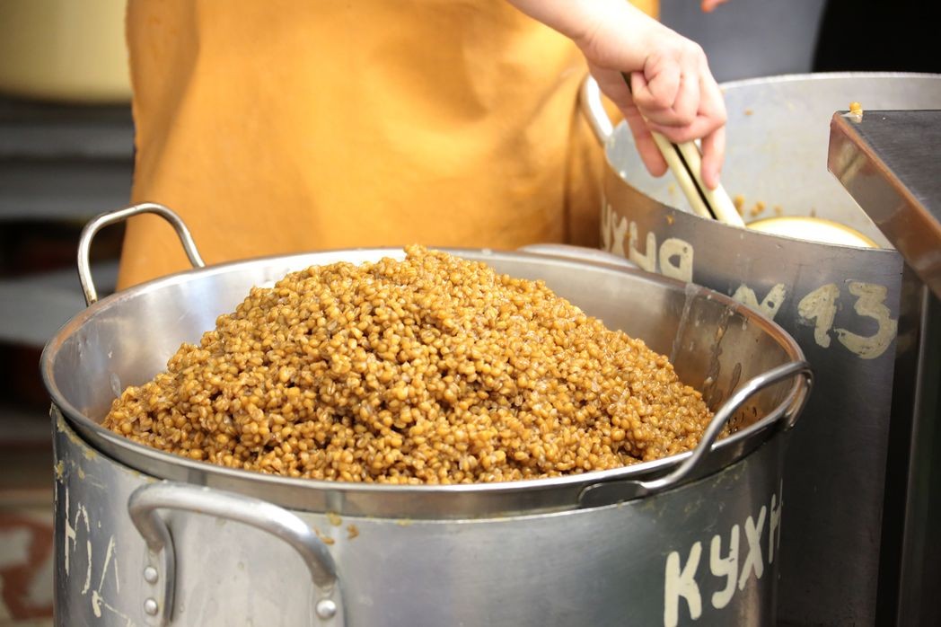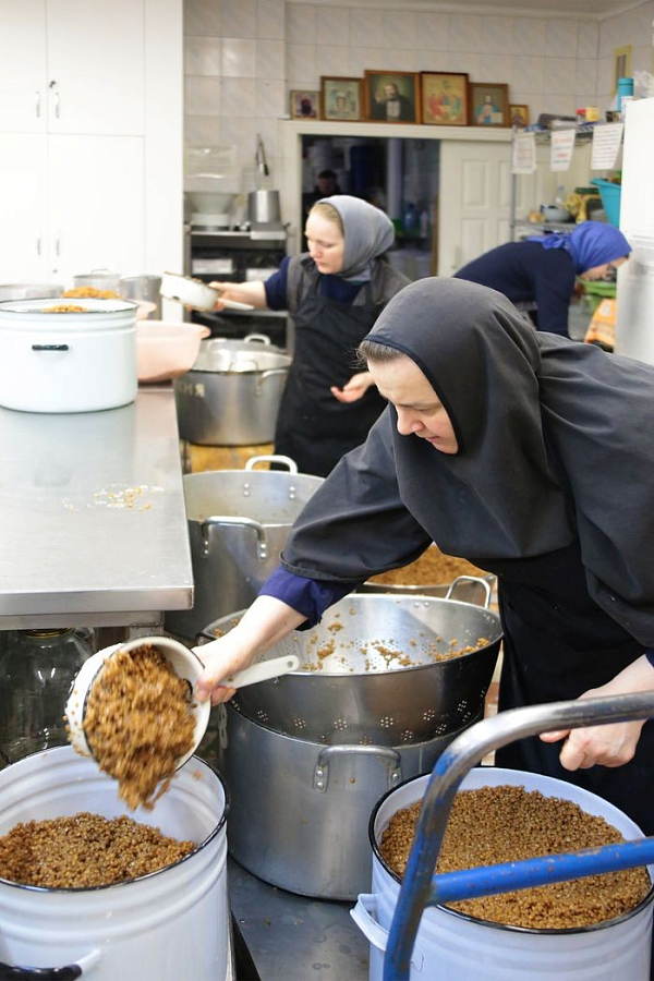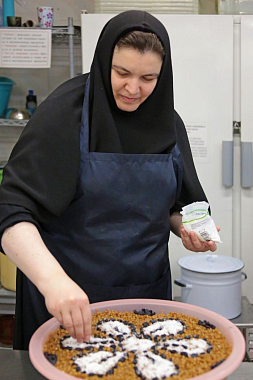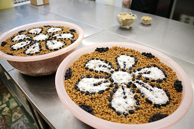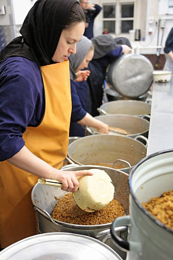 Рано утром сестры монастыря приготовили пятнадцать пятидесятилитровых кастрюль с коливом, которое владыка Георгий освятил на молебне.
