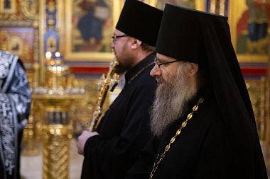 В монастырском храме иконы Божией Матери «Всецарица» Его Высокопреосвященству сослужили: руководитель Административного секретариата Красноярской епархии, настоятель Покровского кафедрального собора Красноярска митрофорный протоиерей Владимир Дорош; исполняющий обязанности секретаря Красноярской епархии, благочинный церквей Левобережного округа, наместник красноярского Успенского мужского монастыря игумен Иннокентий (Нилов); благочинный больничных храмов г. Красноярска, настоятель красноярских храмов апостола Андрея Первозванного и великомученика Димитрия Солунского иерей Виталий Вальтер; насельники Успенской мужской обители и штатные священнослужители Покровского собора Красноярска.