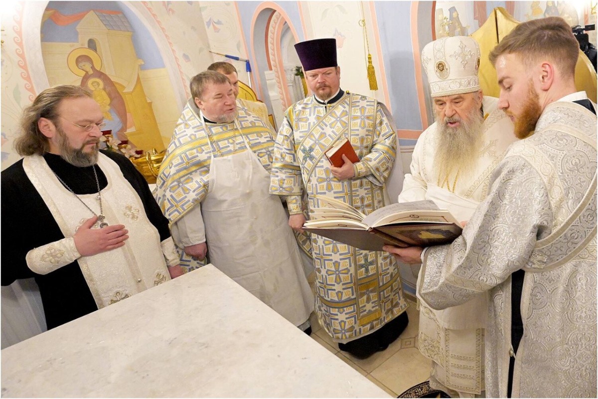 В крышку каменного престола были вложены частицы мощей священномученика Владимира Четверина.