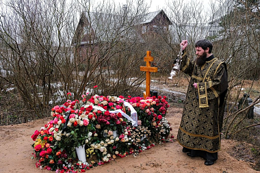 По окончании богослужения владыка Савва отслужил заупокойную литию возле могилы новопреставленного А. И. Сидорова, профессора МДАиС, который похоронен за алтарем собора на территории монастыря.