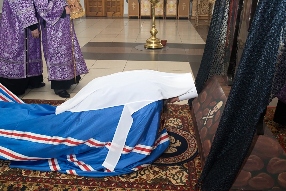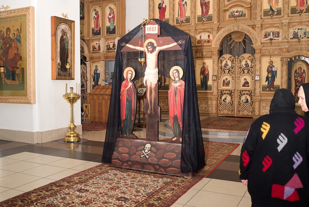 В завершение службы все верующие с благоговением подходят поклониться перед Распятием, Крестом Христовым, который на пассии выносится на середину храма.