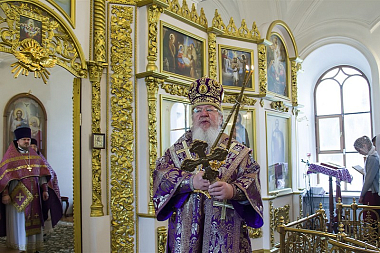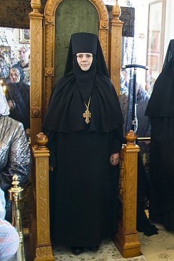 У входа в Преображенский собор обители архипастыря встречали настоятельница Толшевского Спасо-Преображенского женского монастыря игумения Варвара (Сажнева) с сестрами.