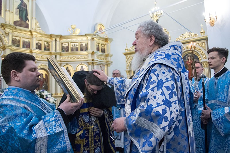 На малом входе глава Воронежской митрополии совершил возведение наместника Дивногорского монастыря иеромонаха Алексия (Сукачева) в сан игумена и вручил новопоставленному игуменский посох. Возведение было совершено в связи с определением Священного Синода Русской Православной Церкви об утверждении иеромонаха Алексия (Сукачева) в должности наместника Успенского Дивногорского мужского монастыря (журнал № 139 заседания Священного Синода от 28 декабря 2018 года).