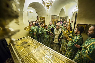 В завершение глава Псковской митрополии совершил славление и прочитал молитву празднуемому святому перед ракой с его честными мощами.