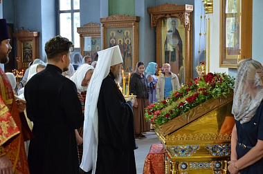 По окончании Литургии митрополит Алексий совершил славление святому великомученику Пантелеимону перед иконой с частицей его святых многоцелебных мощей.