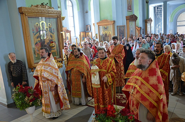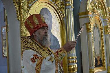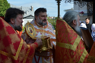 За Литургией Его Высокопреосвященству сослужили: благочинный монастырей Тульской епархии, наместник Свято-Успенского мужского монастыря г. Новомосковска игумен Агафангел (Болдин); наместник Щегловского монастыря архимандрит Клавдиан (Ларьков); братия обители в священном сане.