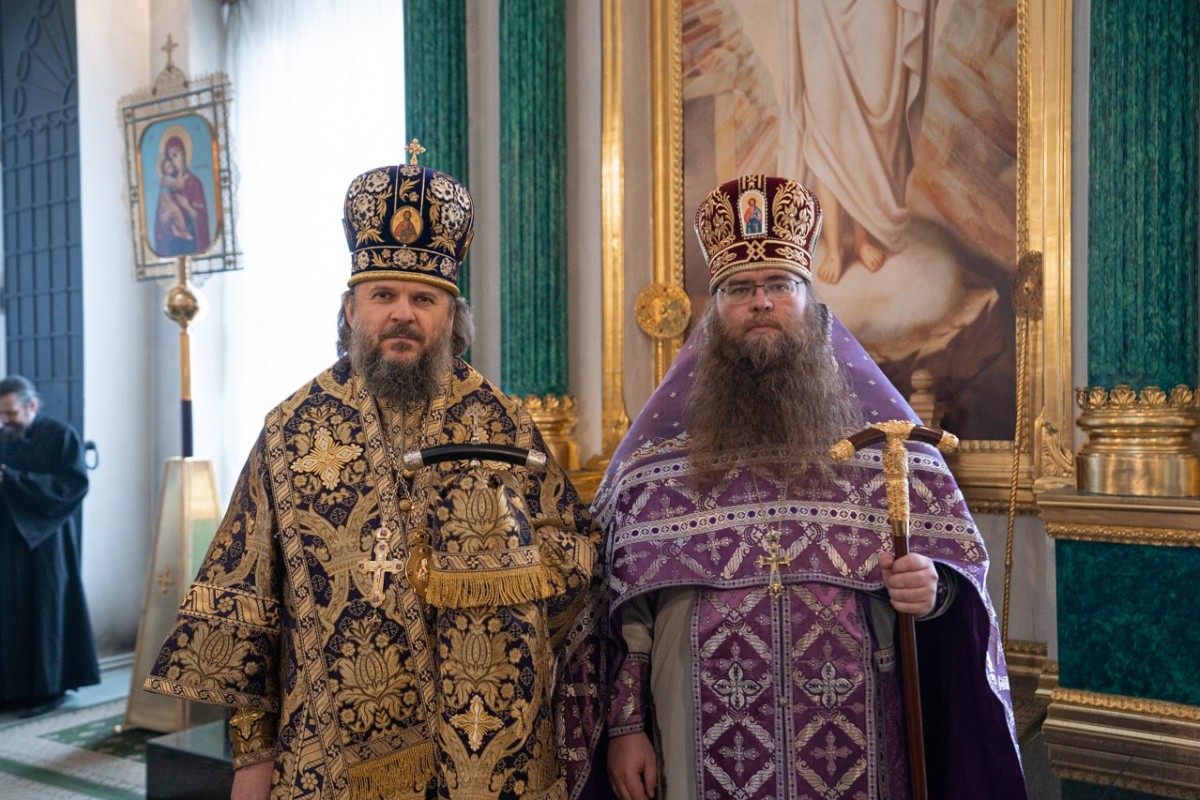 На малом входе архипастырь вручил новому наместнику архимандриту Стефану (Тараканову) игуменский жезл.