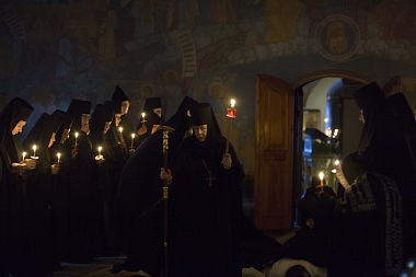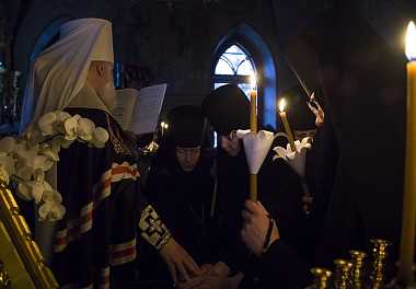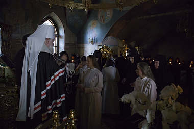 «Сегодня наш монашеский чин пополнился новыми сестрами. Каждый раз, когда слышишь "объятия отча отверсти ми потщися", перед нами встает образ отца, убеленного сединами, который проглядел глаза свои, истоптал ноги, выходя на дальнюю дорогу, дабы увидеть заблудшего сына, который бы по пыльной дороге шел к отеческому дому.